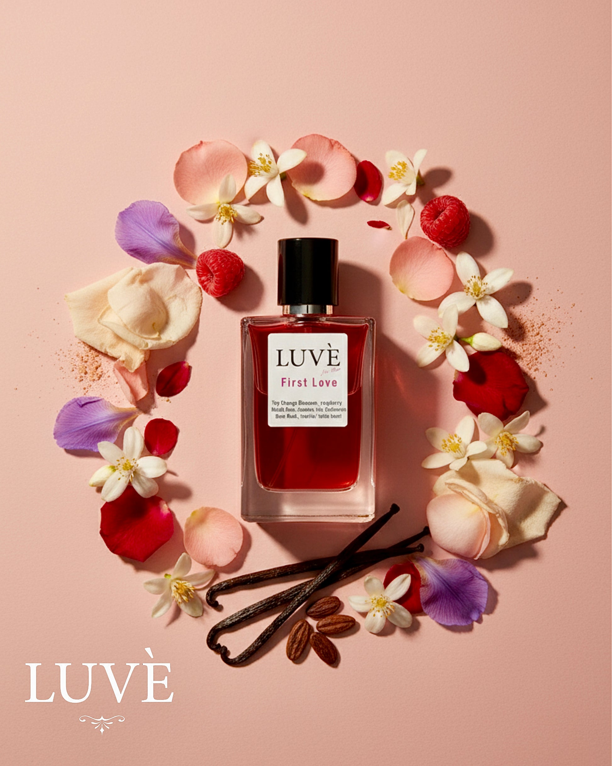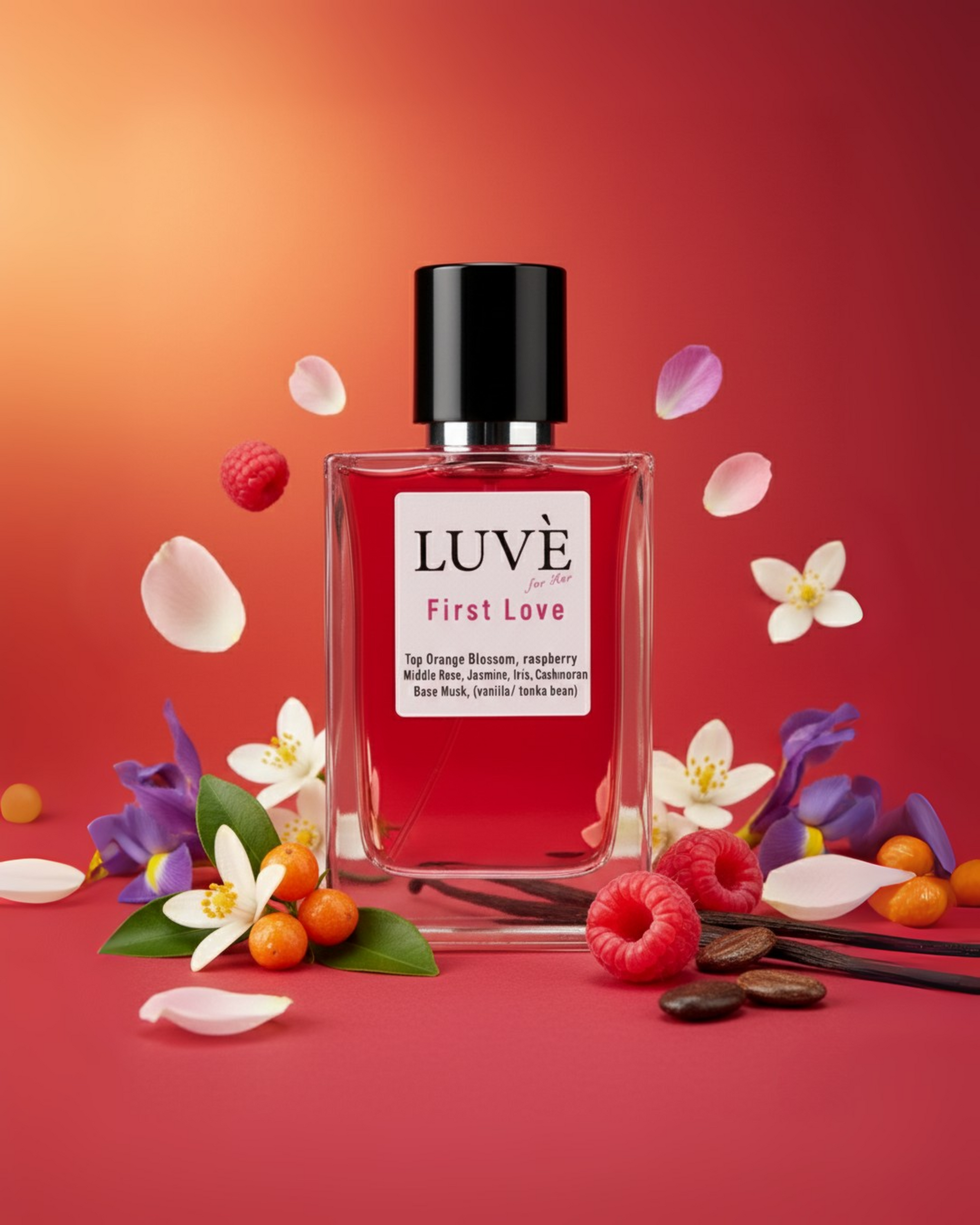 Romantic and timeless, First Love embodies elegance. Fruity orange blossom and raspberry open the scent, blending seamlessly with a bouquet of rose, jasmine, iris, and cashmoran. A soft, sensual base of musk, vanilla, and tonka bean creates lasting warmth.