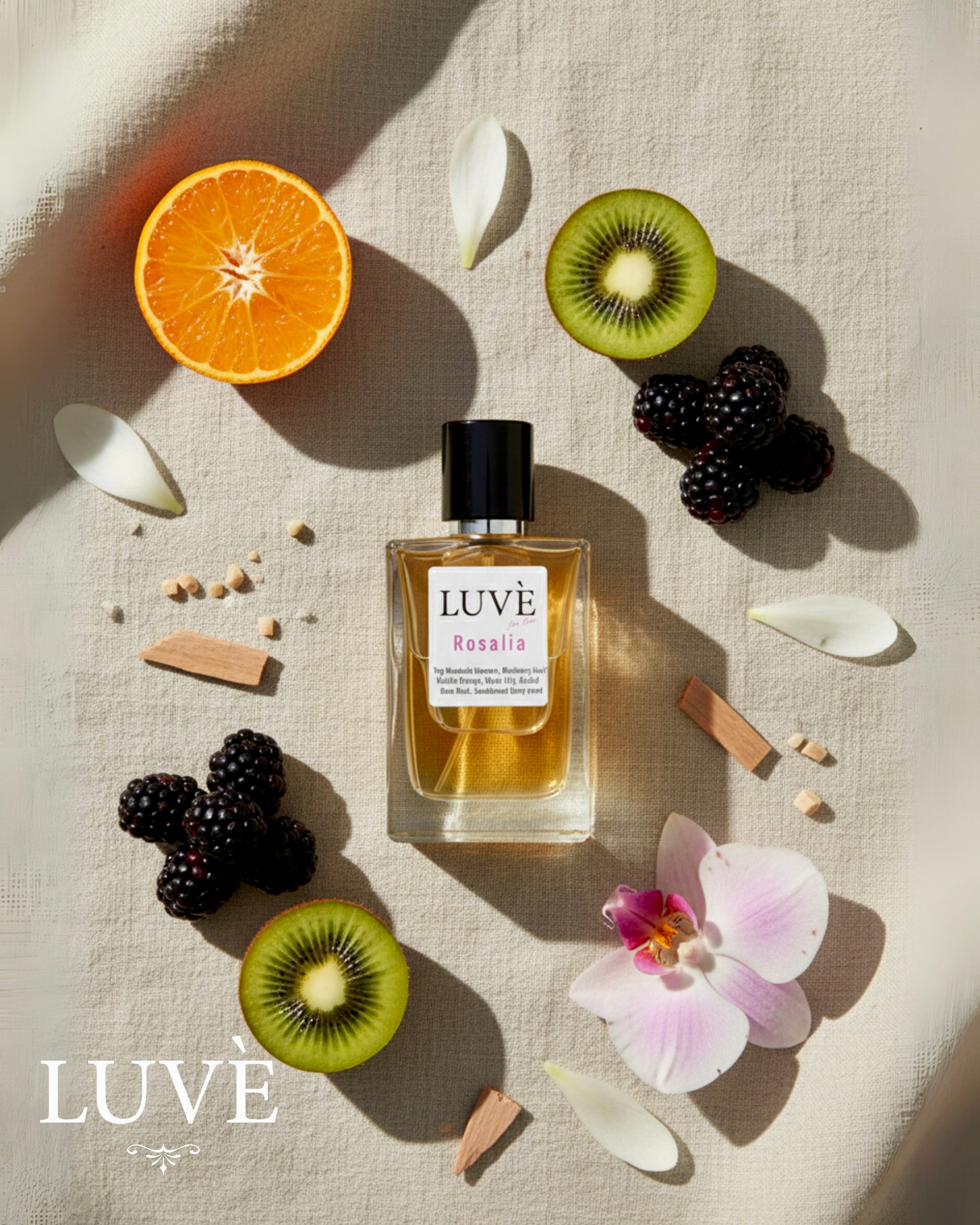 A radiant and feminine fragrance. Bright mandarin blossom and blackberry kiwi sparkle at the top, flowing into a heart of orange, water lily, and orchid. The base lingers with sensual musk, sandalwood, and ebony wood.